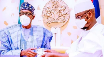 President of the Federal Republic of Nigeria Muhammadu Buhari is showing the NIMC (National Identity Management Com...
